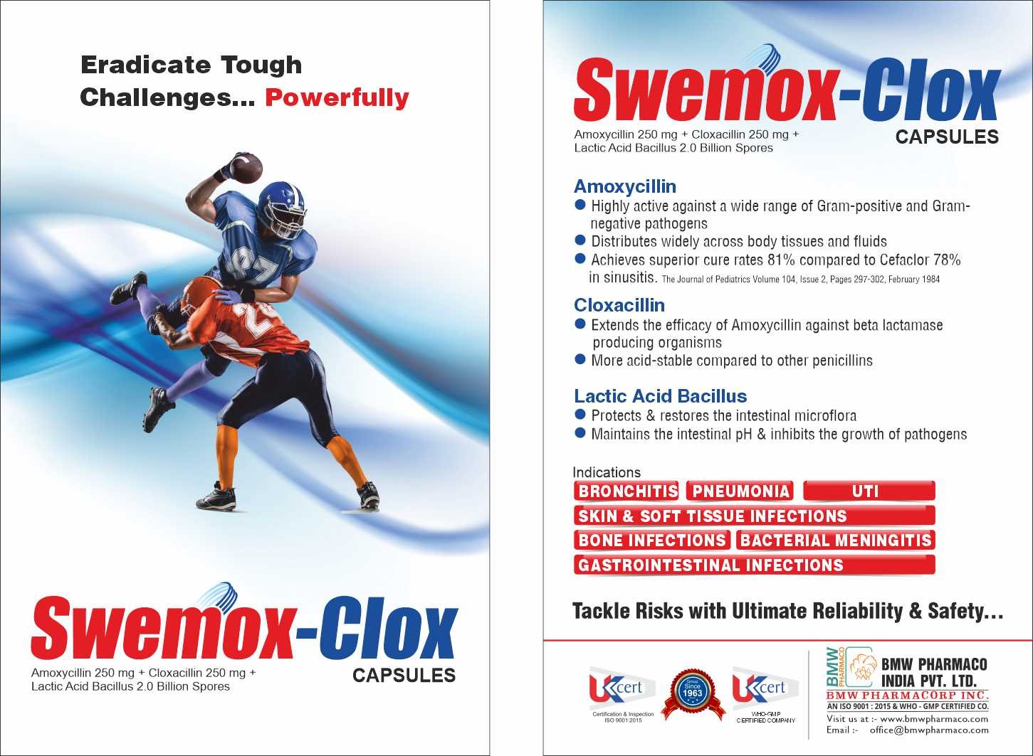 |  | SWEMOX CLOX CAP | Amoxycillin 250 mg + Cloxacillin 250 mg + Lactic Acid Bacillus 2.0 Billion Spores | BLISTER | 10 x 10 |  |  |