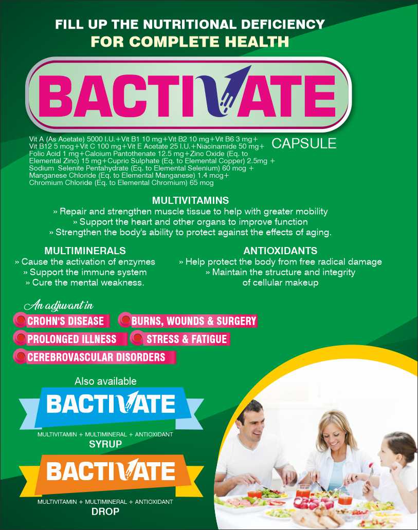|  | BACTIVATE  CAP | Vitamin A (As Acetate) 2000 I.U. + Vit B1 1.4 mg + Vit B2 1.6 mg + Vit B6 2 mg  + Vit B12 1 mcg + Vit C 100 mg + Vit E Acetate 25 I.U. + Niacinamide 18 mg + Folic Acid 1mg + Calcium Pantothenate 12.5 mg + Zinc Oxide (Eq. to Elemental Zinc) 15 mg + Cupric Sulphate (Eq. to Elemental Copper) 2.5 mg + Sodium  Selenite Pentahydrate (Eq. to Elemental Selenium) 60 mcg + Manganese Chloride (Eq. to Elemental Manganese) 1.4 mcg + Chromium Chloride (Eq. to Elemental  Chromium) 65mcg | BLISTER | 5 x 2 x 15 |  |  |