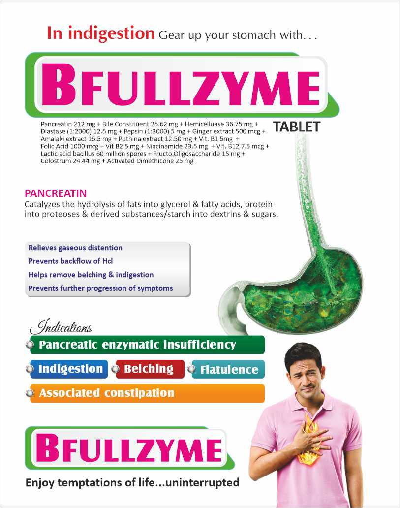 |  | BFULLZYME  TAB | Pancreatin 212 mg + Bile Constituent 25.62 mg + Hemicellulose 36.75 mg + Diastase (1:2000) 12.5 mg + Pepsin (1:3000) 5 mg + Ginger extract 500 mcg  + Amalaki extract 16.5 mg +Puthina extract 12.50 mg + Vit. B1 5 mg  + Folic Acid 1000 mcg + Vit B2 5 mg + Niacinamide 23.5 mg  + Vit. B12 7.5 mcg + Lactic acid bacillus 60 million spores + Fructo Oligosaccharide 15 mg + Colostrum 24.44 mg + Activated Dimethicone 25 mg | ALU-ALU | 10 x 10 |  |  |