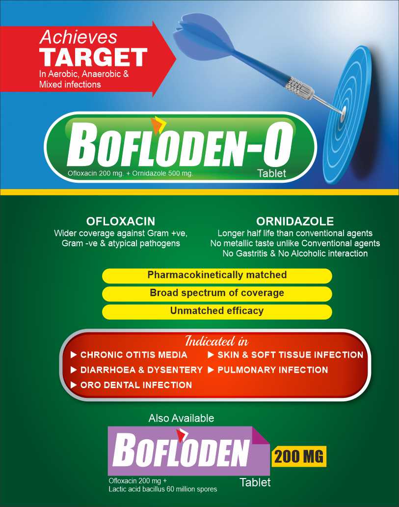 |  | BOFLODEN  O  TAB | Ofloxacin200 mg + Ornidazole 500 mg | BLISTER | 10 x 10 |  |  |