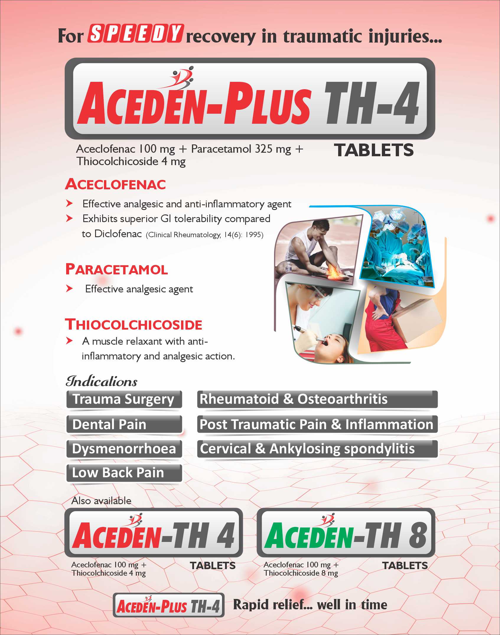 |  | ACEDEN  PLUS  TH  4  TAB | Aceclofenac 100 mg + Paracetamol 325 mg + Thiocolchicoside 4 mg | ALU-ALU | 10 x 10 |  |  |