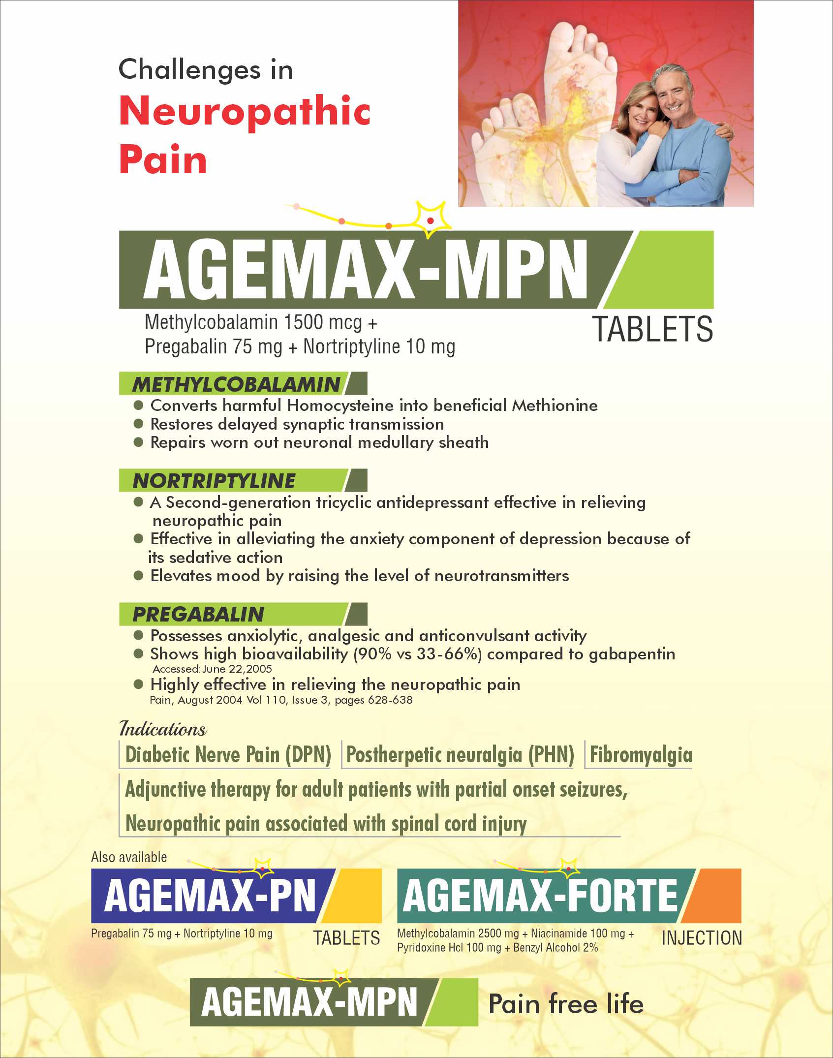 |  | AGEMAX  MPN  TAB | Pregabalin 75 mg + Nortriptyline 10 mg + Methylcobalamin 1500 mcg | ALU - ALU | 10 x 10 |  |  |