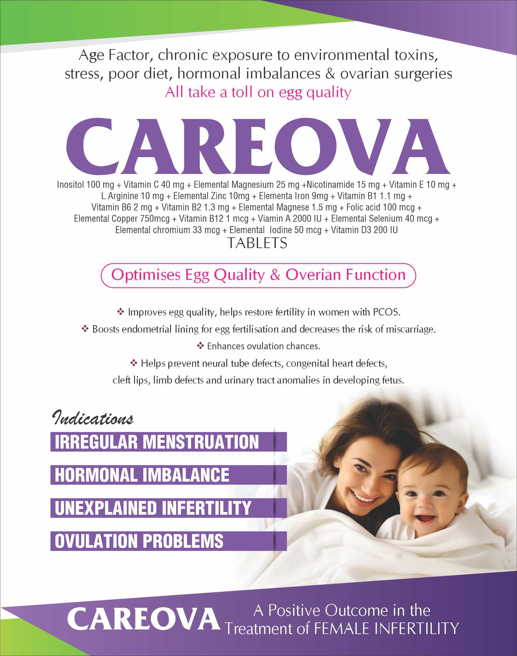 |  | CAREOVA  TAB | Inositol 100 mg + Vitamin C 40 mg + Elemental Magnesium 25 mg +Nicotinamide 15 mg + Vitamin E 10 mg + L Arginine 10 mg + Elemental Zinc 10mg + Elementa Iron 9mg + Vitamin B1 1.1 mg + Vitamin B6 2 mg + Vitamin B2 1.3 mg + Elemental Magnese 1.5 mg + Folic acid 100 mcg + Elemental Copper 750mcg + Vitamin B12 1 mcg + Viamin A 2000 IU + Elemental Selenium 40 mcg + Elemental chromium 33 mcg + Elemental  Iodine 50 mcg + Vitamin D3 200 IU | ALU-ALU | 10 x 10 |  |  |