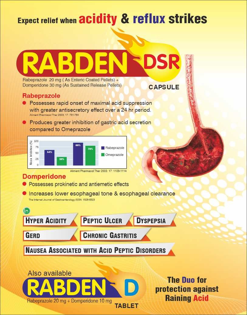 |  | ACEDEN  R  CAP | Aceclofenac 200 mg  (As Sustained Release Pellets)  + Rabeprazole 20 mg (As Enteric Coated Pellets) | ALU-ALU | 10 x 10 |  |  |