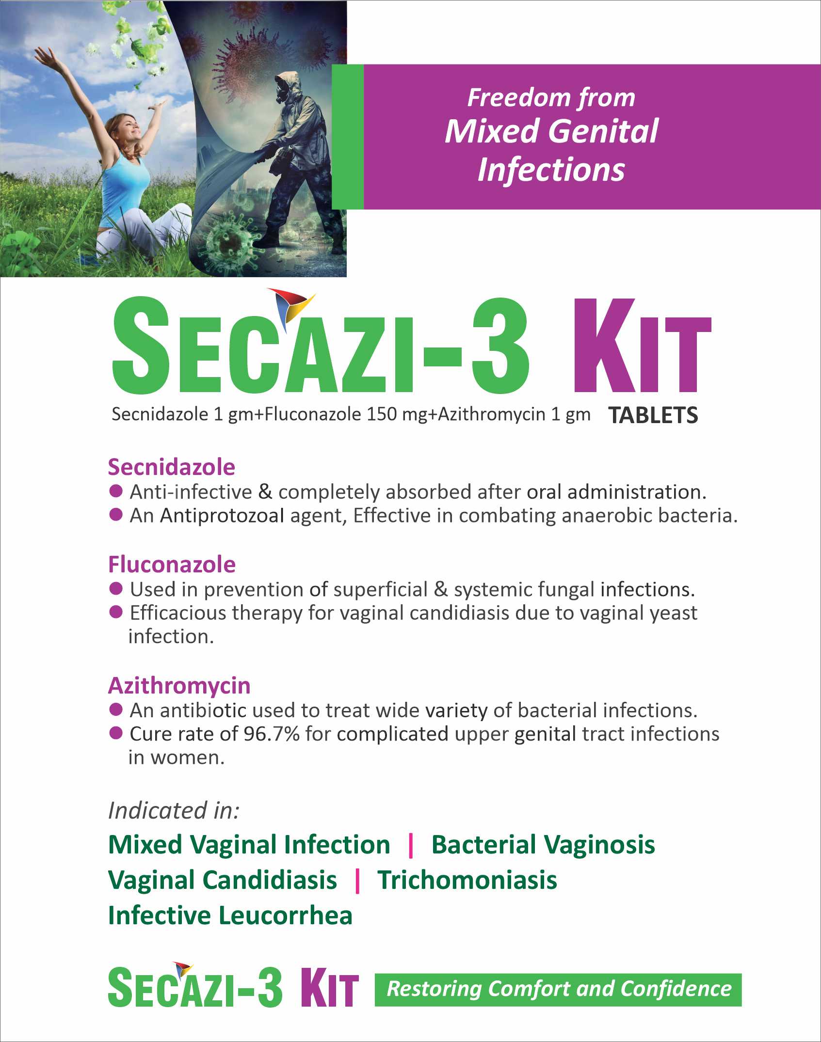 |  | SECAZI  3  KIT  TAB | Secnidazole 1gm + Fluconazole 150mg + Azithromycin 1gm | BLISTER | 10 x 1 KITS |  |  |