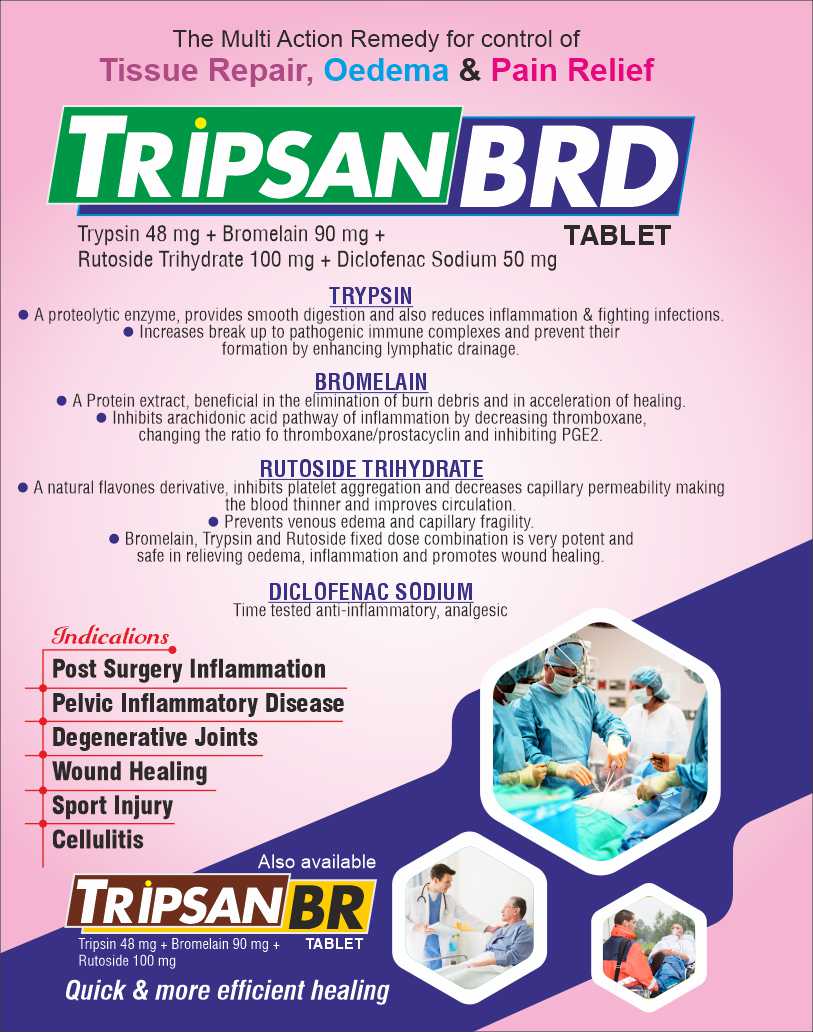 |  | TRIPSAN  BRD   TAB | Trypsin 48 mg + Bromelain 90 mg + Rutoside Trihydrate 100 mg + Diclofenac  Sodium 50 mg | ALU-ALU | 10 X 1 X 10 |  |  |