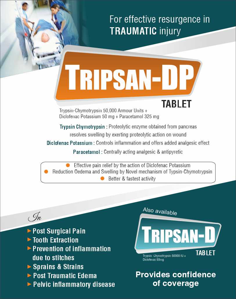 |  | TRIPSAN  DP  TAB | Trypsin-Chymotrypsin 50,000 Armour Units + Diclofenac Potassium 50 mg + Paracetamol 325 mg | ALU-ALU | 10 X 10 |  |  |