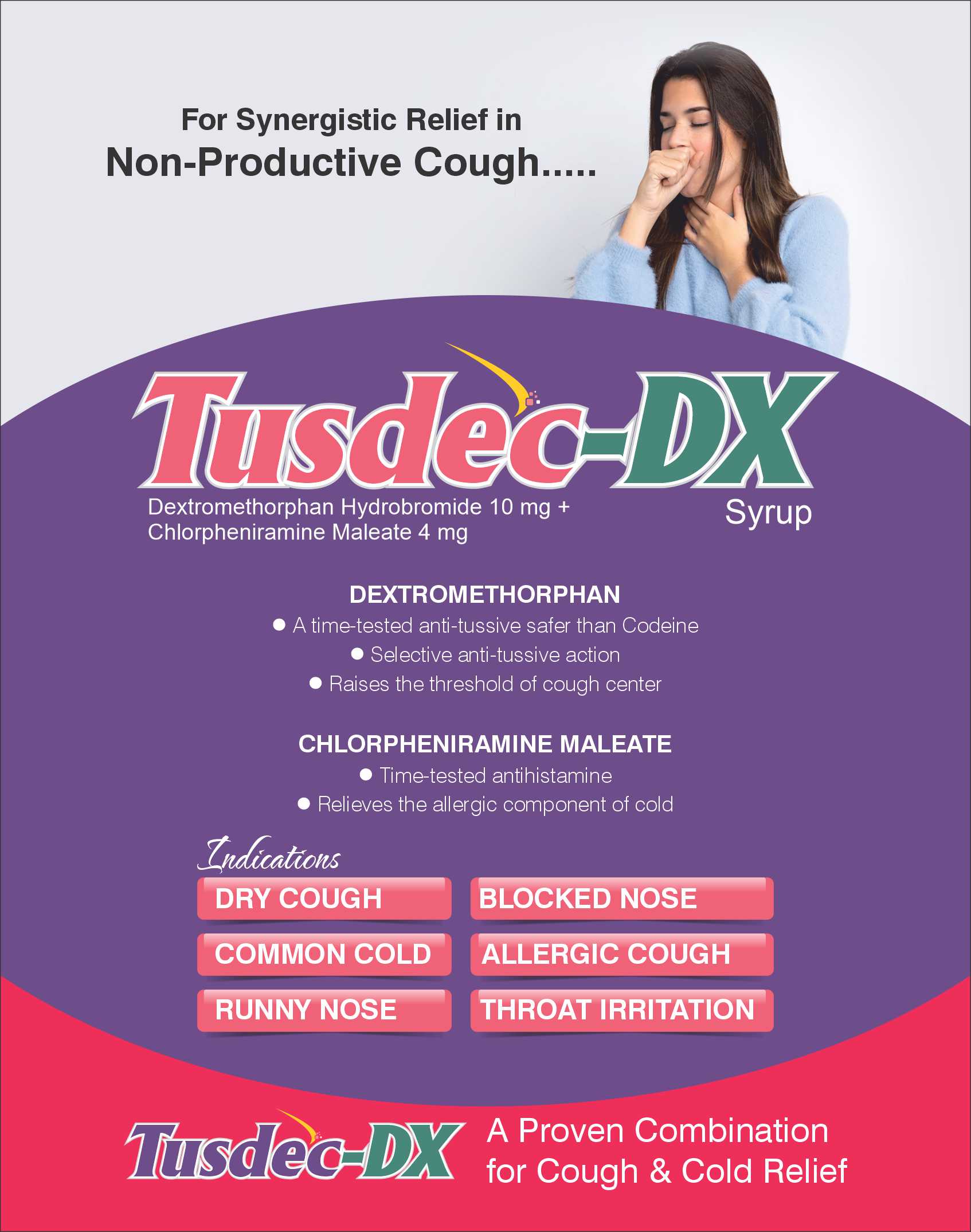 |  | TUSDEC  DX  SYRUP | Dextromethorphan Hydrobromide 10 mg + Chlorpheniramine Maleate 4 mg | PET  BOTTLE | 100 ML |  |  |