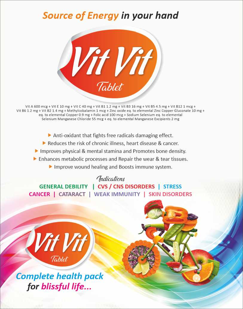 |  | VIT  VIT  TAB | Vitamin A 600 mcg + Vitamin E 10 mg + Vitamin C 40 mg + Vitamin B1 1.2 mg + Vitamin B3 16 mg + Vitamin B5 4.5 mg + Vitamin B12 1 mcg + Vitamin B6 1.2 mg + Vitamin B2 1.4 mg  Methylcobalamin 1 mcg + Zinc oxide 10 mg + Copper Gluconate 0.9 mg + Folic acid 100 mcg + Sodium Selenium 55 mcg +  Manganese Chloride 2 mg | ALU-ALU | 5 X 3 X 10 |  |  |