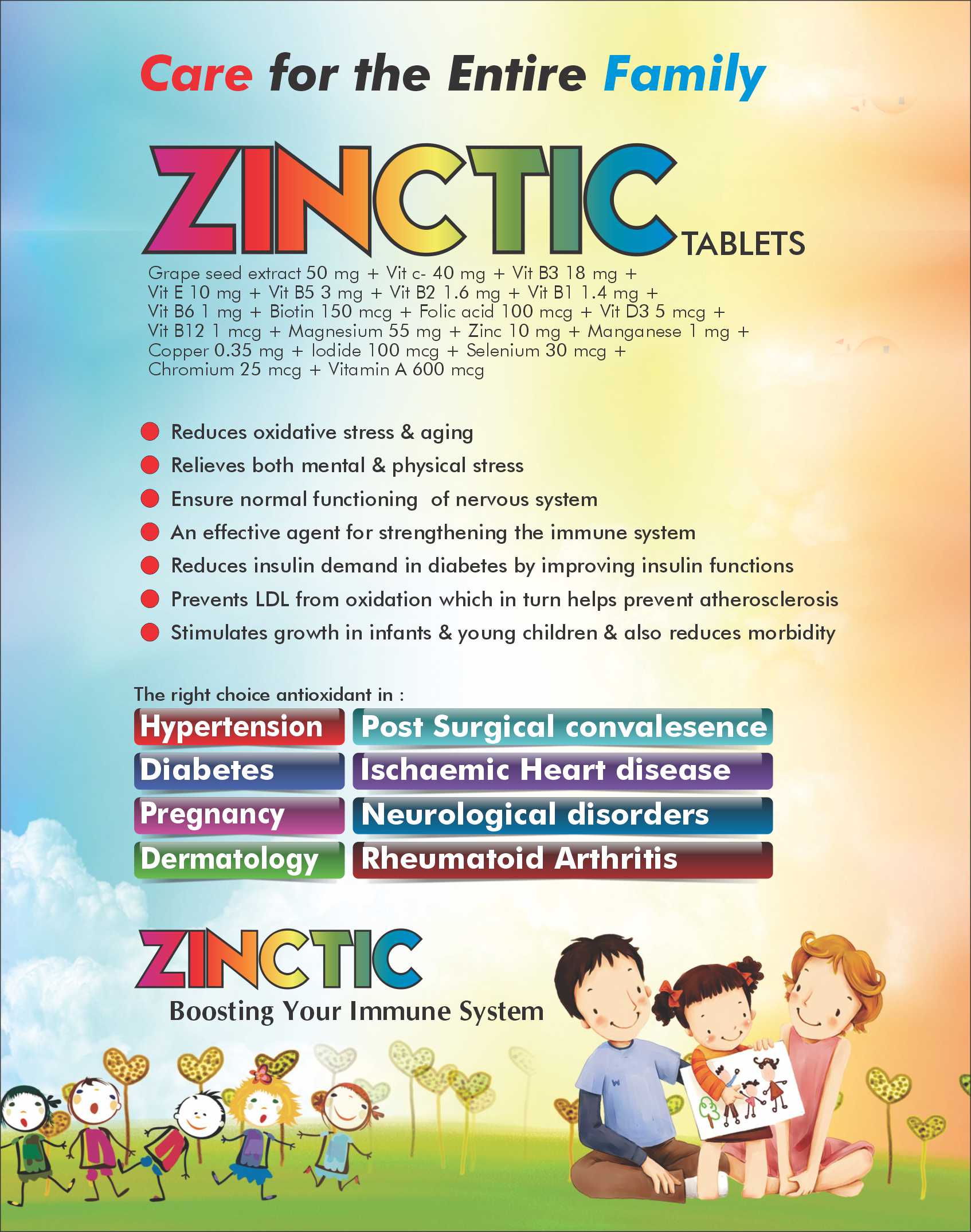 |  | ZINCTIC   TAB | Grape seed extract 50 mg + Vit c- 40 mg + Vit B3 18 mg + Vit E 10 mg + Vit B5 3 mg + Vit B2 1.6 mg + Vit B1 1.4 mg + Vit B6 1 mg + Biotin 150 mcg + Folic acid 100 mcg + Vit D3 5 mcg + Vit B12 1 mcg + Magnesium 55 mg + Zinc 10 mg + Manganese 1 mg + Copper 0.35 mg + Iodide 100 mcg + Selenium 30 mcg + Chromium 25 mcg + Vitamin A 600 mcg | ALU-ALU | 5 x 2 x 15 |  |  |